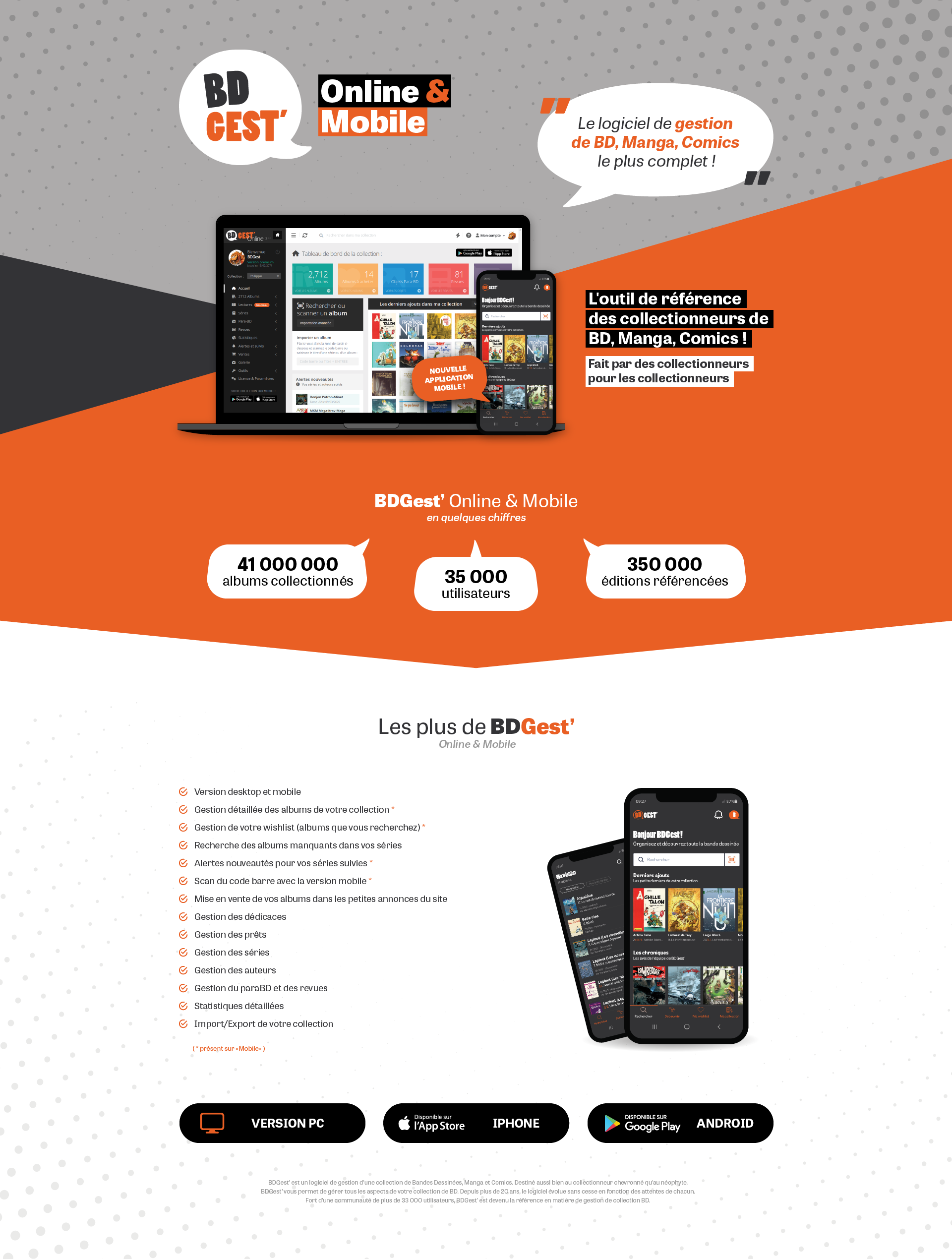 BD Gest' est une application multi-plateforme permettant de gérer, en ligne ou hors-ligne, une collection de bandes dessinées, comics et mangas. Elle a été conçue et développée par Philippe Magneron depuis 1998. C’est la référence des collectionneurs de BD, Comics & Manga !