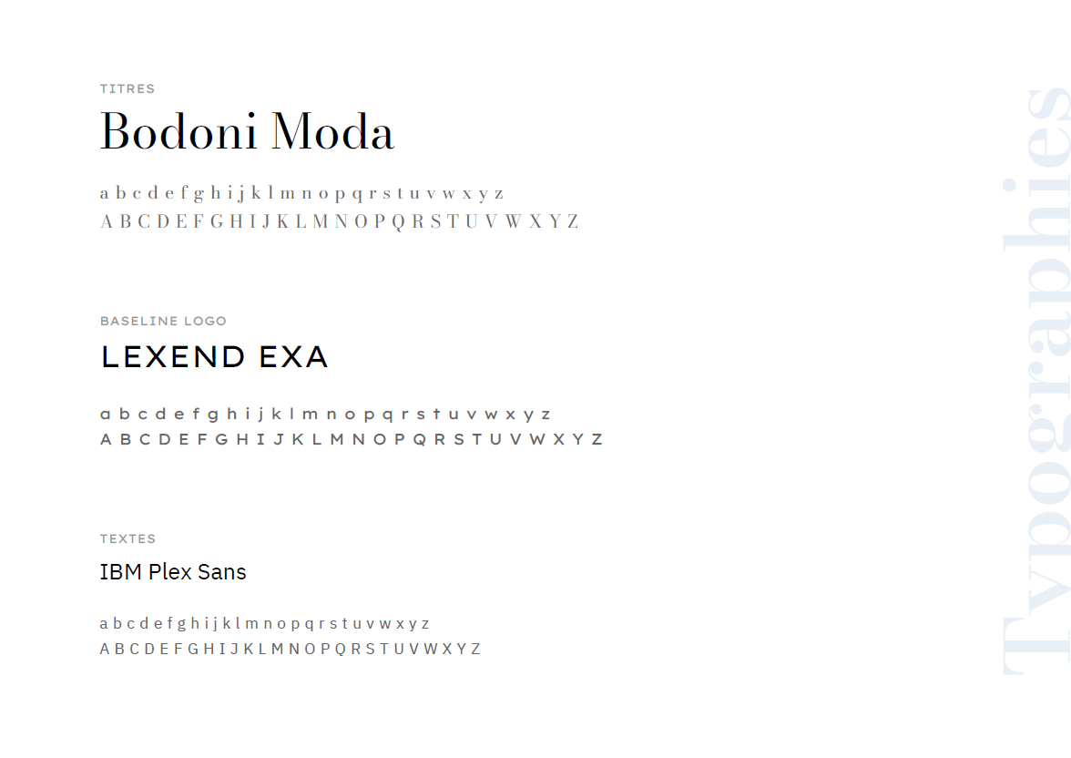 Ci-contre, différentes recherches et propositions faites à la cliente dont la proposition retenue, ainsi que le début du cahier de charte graphique.