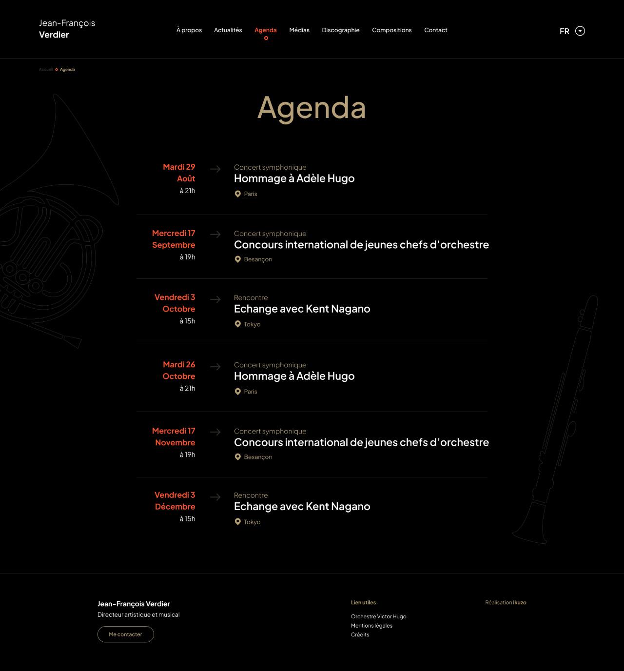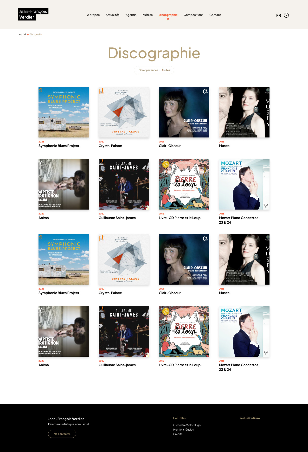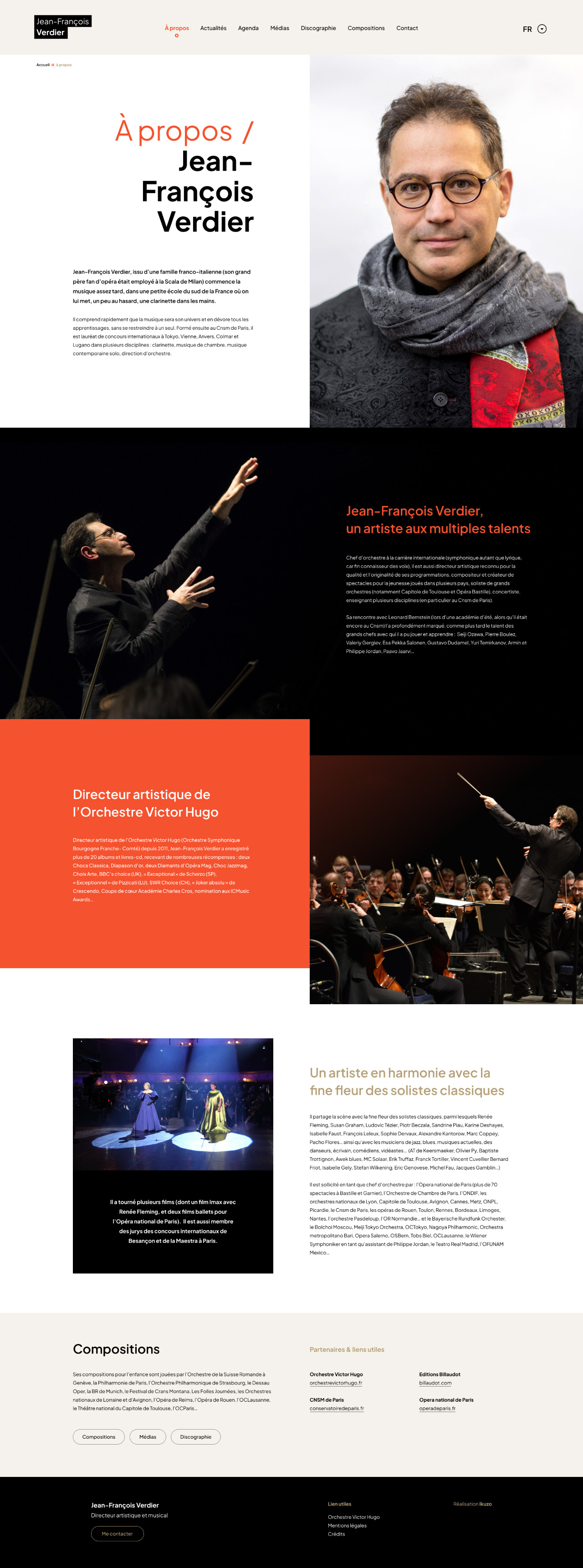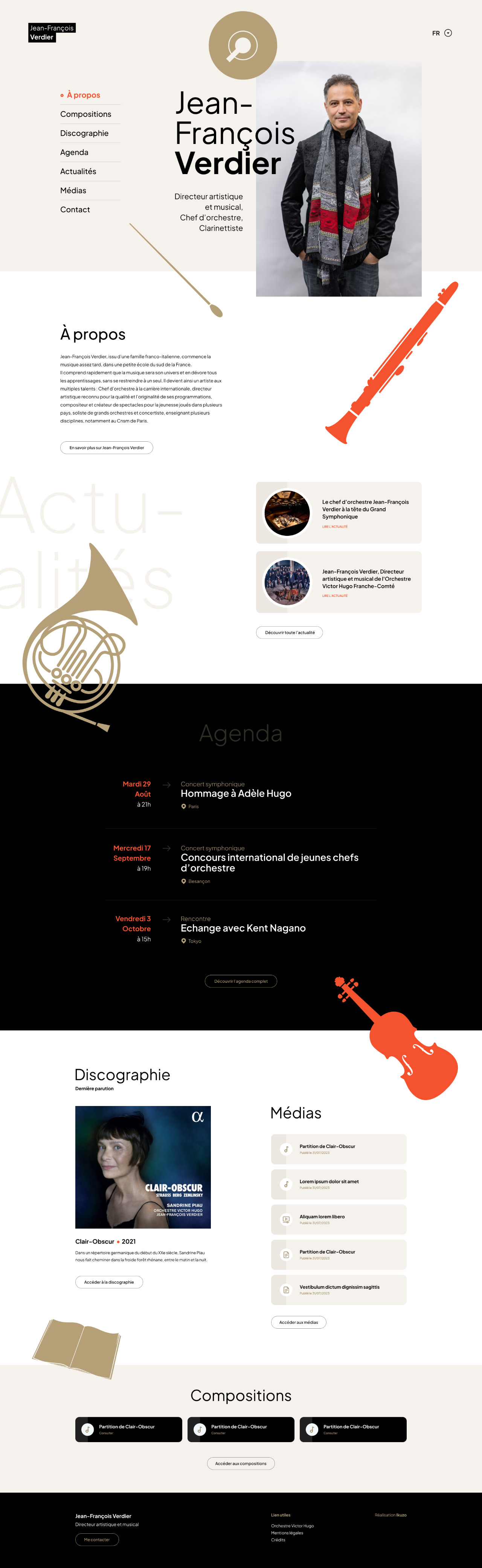 Chef d'orchestre reconnu pour la qualité et l'originalité de ses programmations, tant dans le répertoire symphonique que lyrique, Jean-François Verdier est également un compositeur et un créateur de spectacles pour la jeunesse, joués dans plusieurs pays. Il se produit également en tant que soliste avec de grands orchestres, notamment le Capitole de Toulouse et l'Opéra Bastille, et enseigne dans plusieurs disciplines, notamment au Conservatoire National Supérieur de Musique de Paris. Nous avons réalisé une interface web capable de retranscrire toute ces dimensions et de retransmettre cette aura musicale qui gravie autour : sobre, contrasté, dynamique, classique, avec un petit côté "rock" dans certaines mise en page.