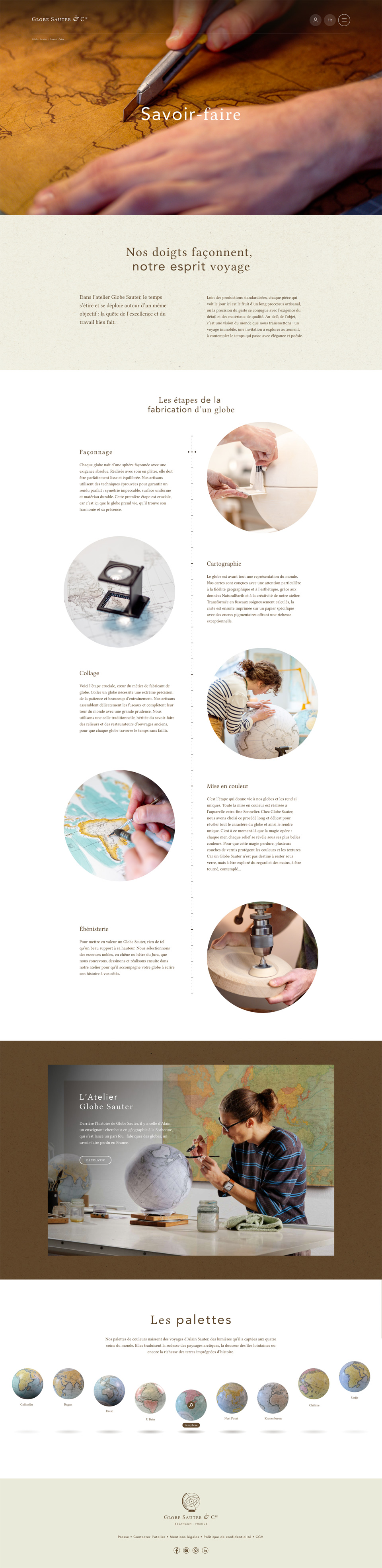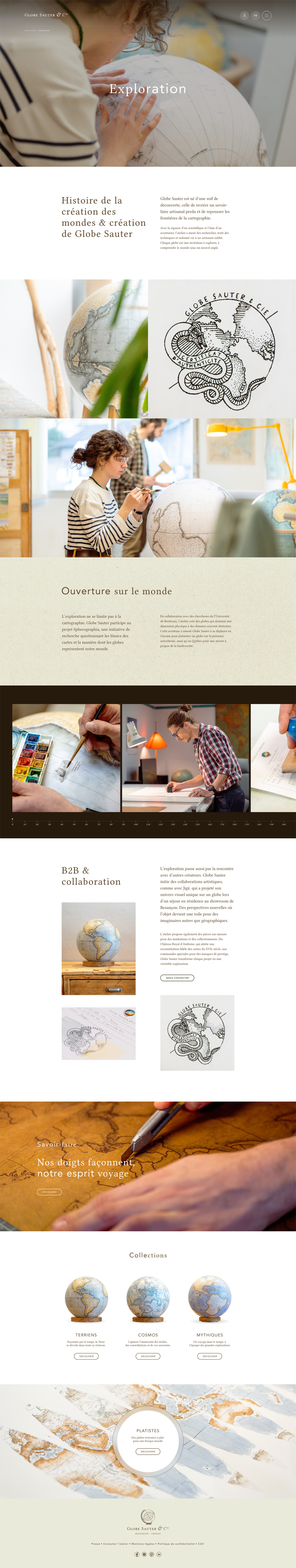 La refonte du site internet de Globe Sauter & Cie avait pour but de leur fournir une vitrine numérique reflétant leur savoir-faire et la qualité de leur travail artisanal unique. Un soin important de mise en valeur des visuels et des textes jusque dans le moindre détail était donc de mise, afin de mettre en avant leur travail et leurs réalisations authentiques.