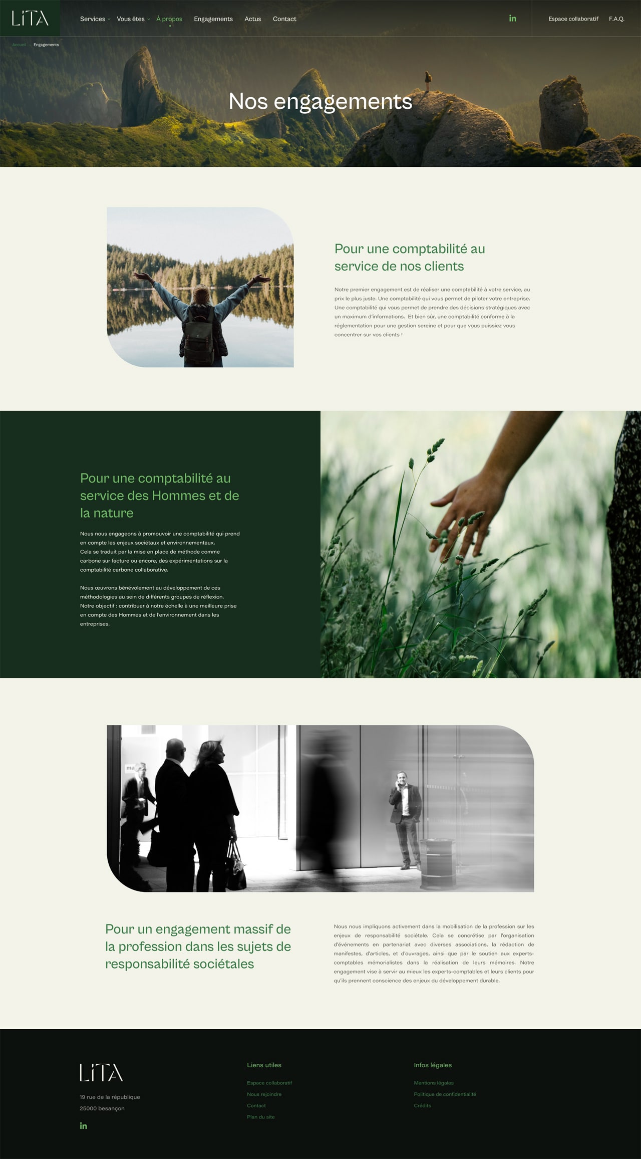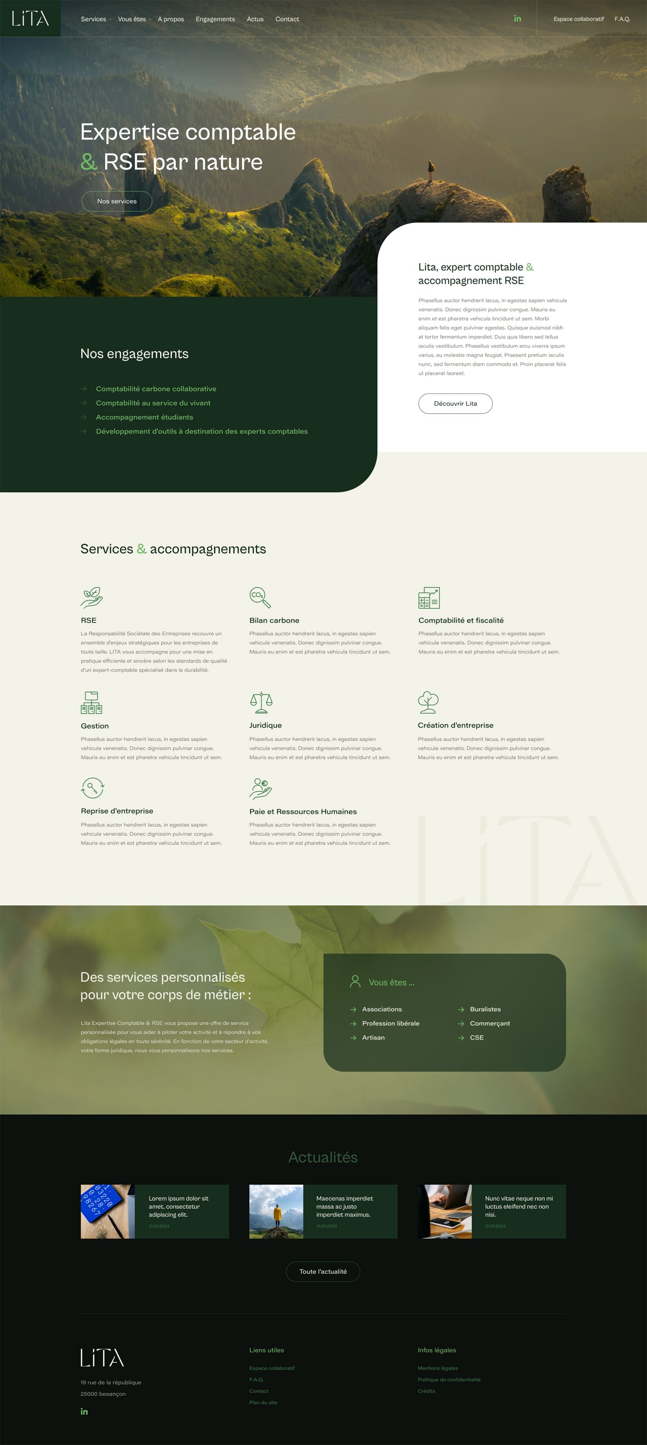 Ikuzo est partit d'une feuille blanche pour ce projet, car Lita est un cabinet d'expertise fraichement créé (début 2024). Tout était à créer : l’identité visuelle qui nous a été confiée, ainsi que toute la structure du site et de la stratégie web associée. Nous avons collaboré étroitement avec notre client pour concevoir un site web qui reflète son image, en mettant l'accent sur l'écologie, la réduction des émissions de carbone, et une esthétique visuellement épurée. Les performances du site, ainsi que les résultats provenant des outils d'analyse d'éco-conception et de performance, attestent de notre réussite dans cette exercice.