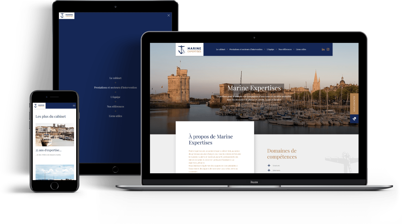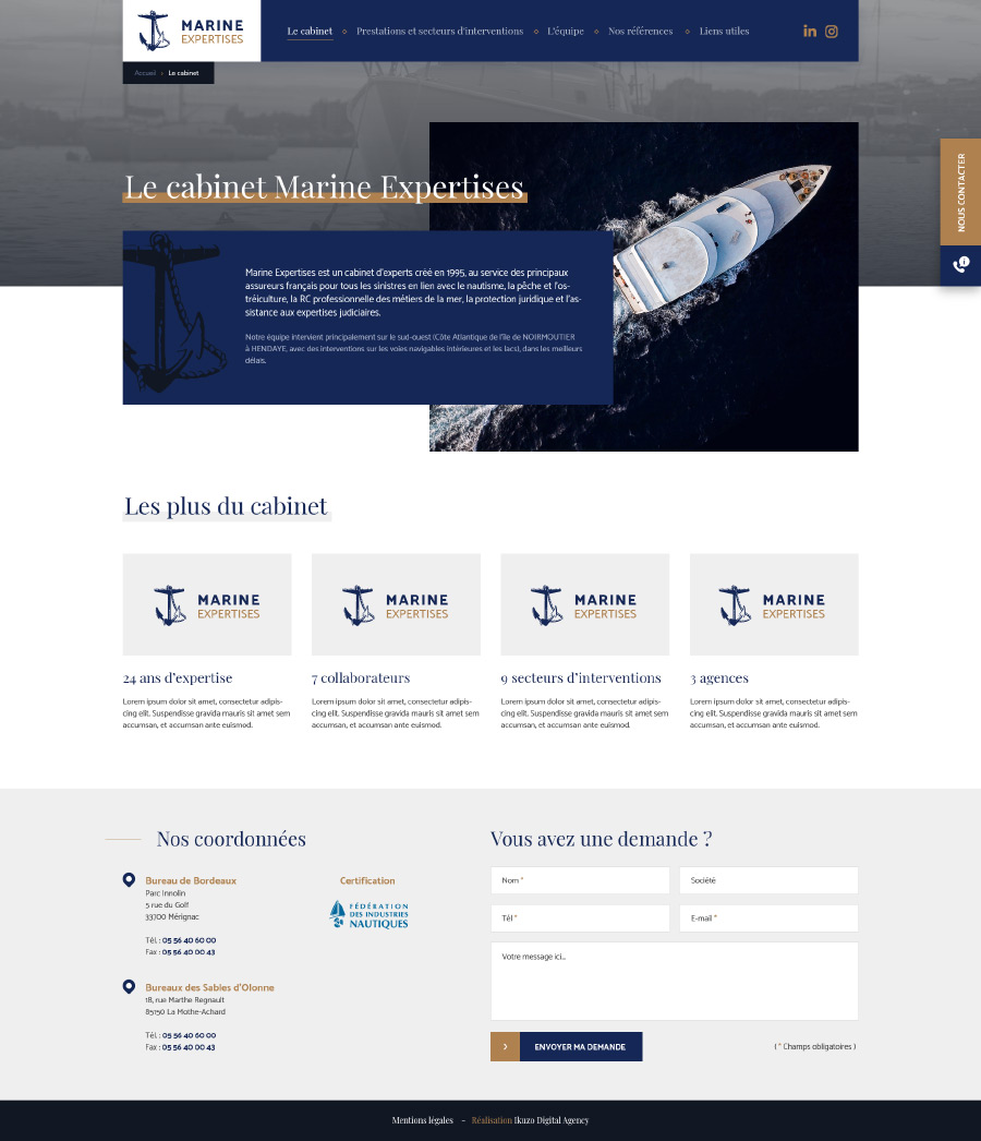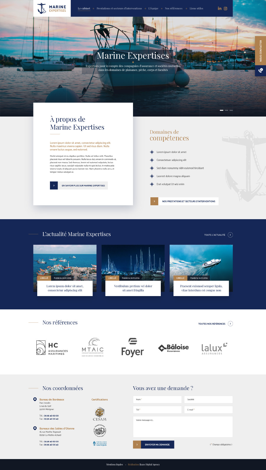 Le site internet de Marine Expertises bénéficie d’une interface web sur-mesure correspondant au brief client. Sobre avec des touches luxueuses, il représente l’esprit du cabinet d’expertise, sérieux et rigoureux.
