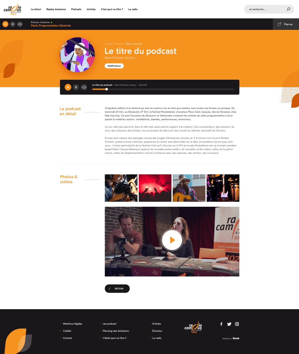 Nous avons opté pour une “navigation ajax” qui affiche les contenus sans rechargement complet de la page, il est ainsi possible d’écouter la radio ou les podcasts pendant la navigation sur le site sans interruption.