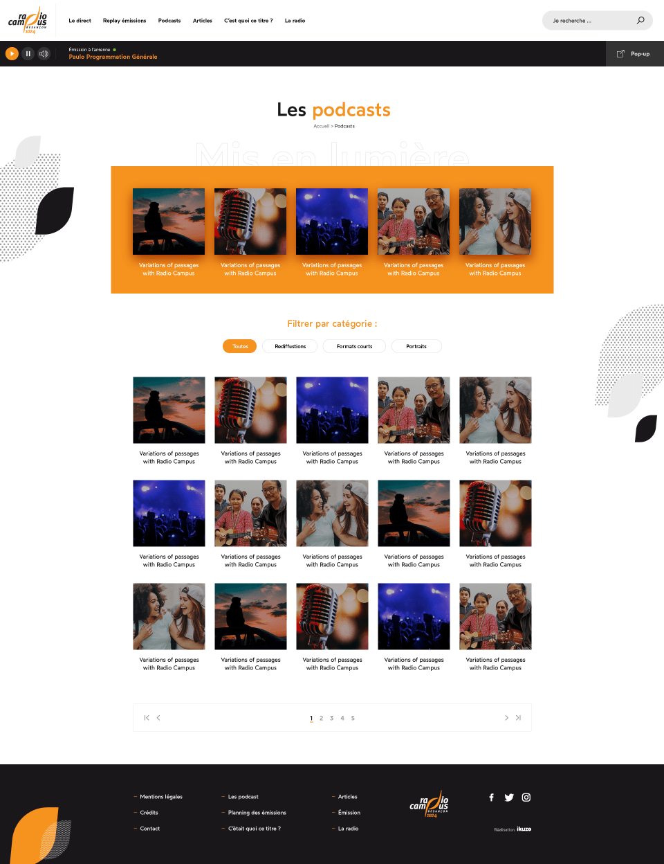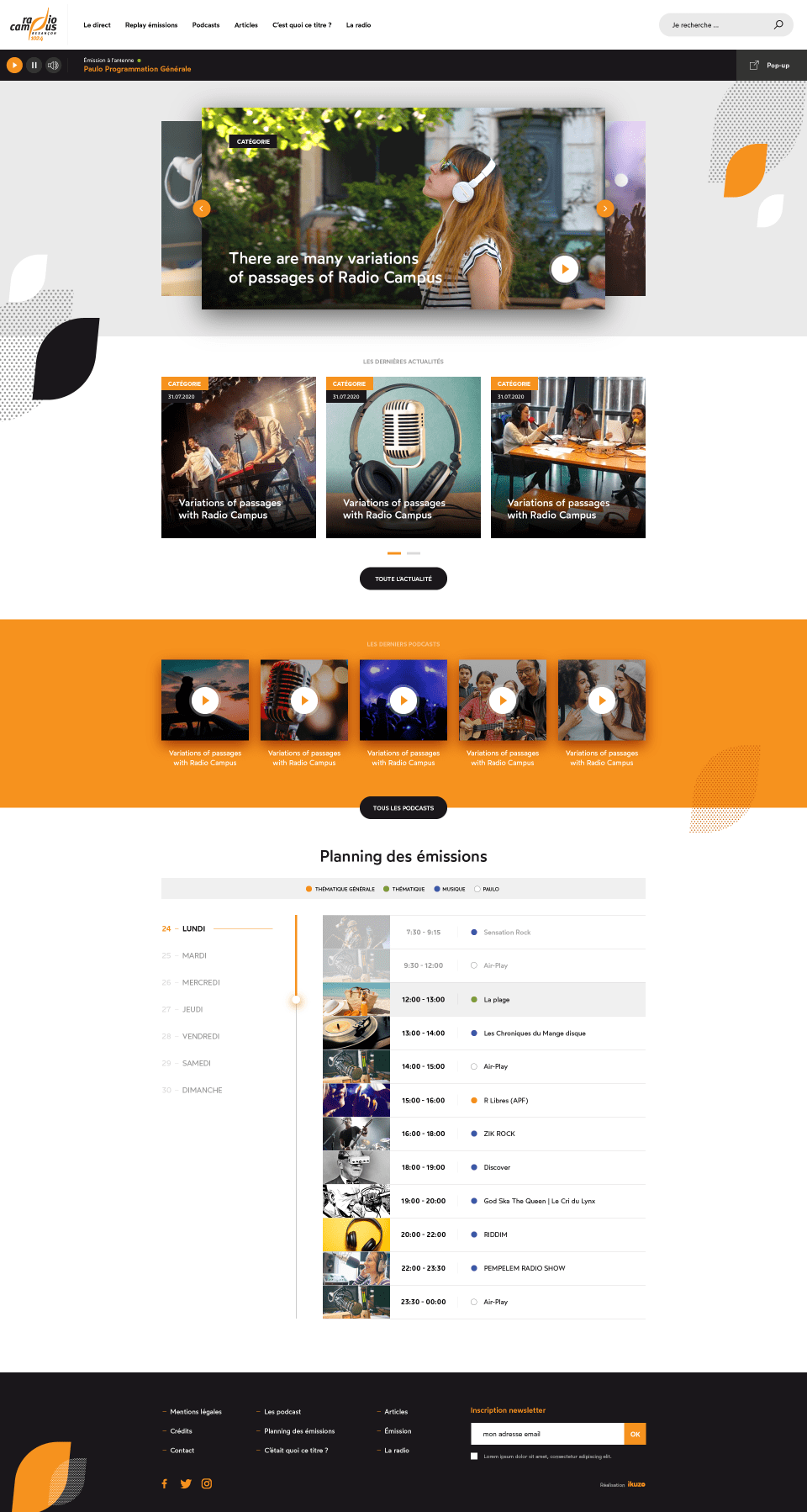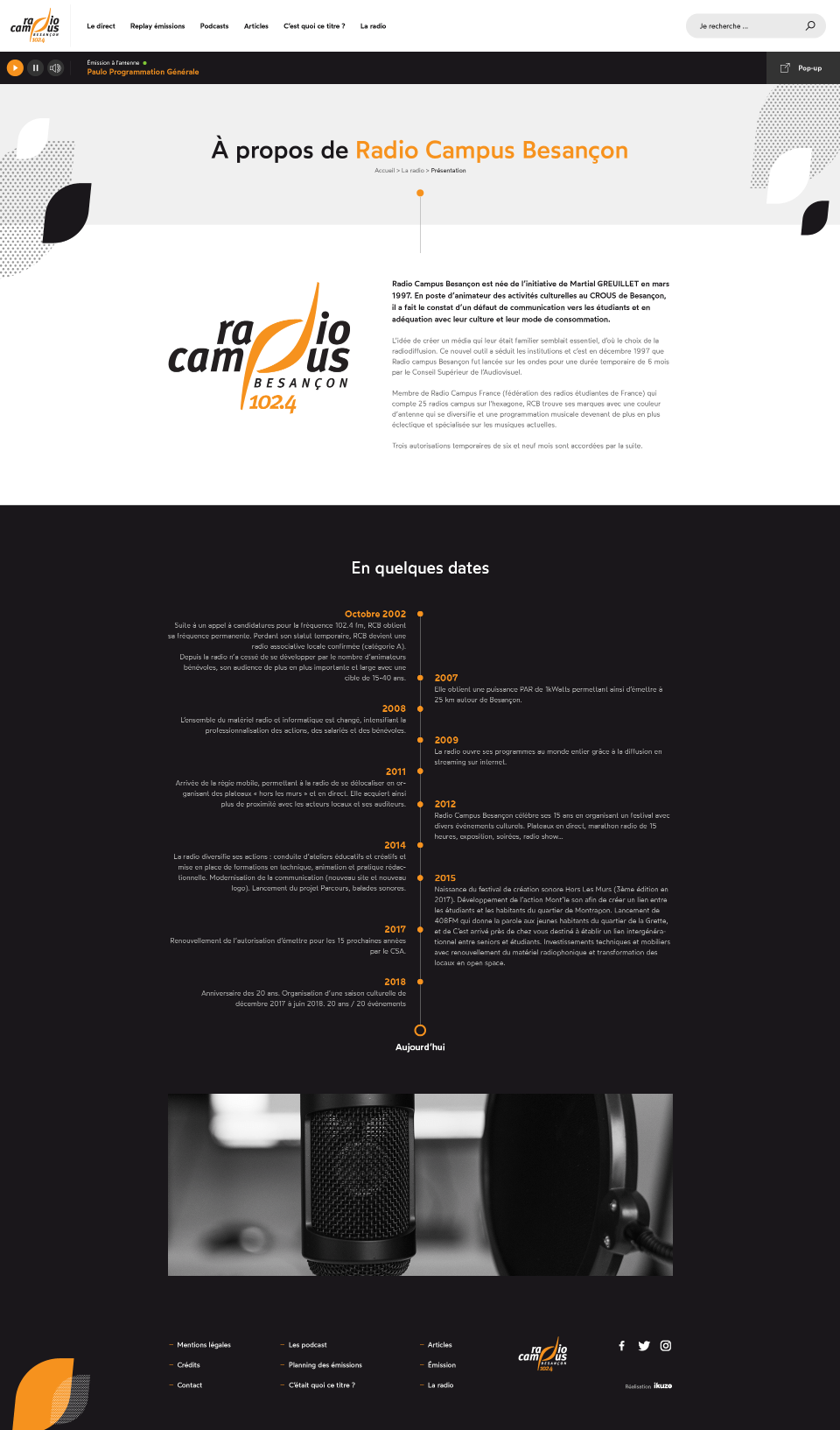 Pour cette refonte complète du site internet de Radio Campus, le but était de repartir sur une nouvelle base technique et graphique, adaptée aux usages des utilisateurs actuels et des administrateurs du site pour leur permettre une meilleure prise en main des contenus éditoriaux. Le nouveau site devait également permettre à Radio Campus d’uploader un maximum de fichiers audio (rediffusions, interviews, plateaux extérieurs, formats courts...) via l’administration du site internet.