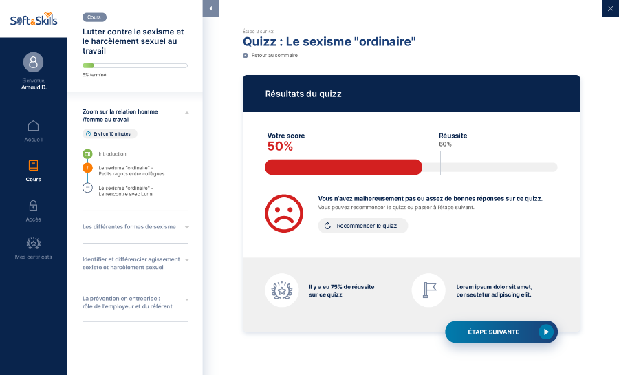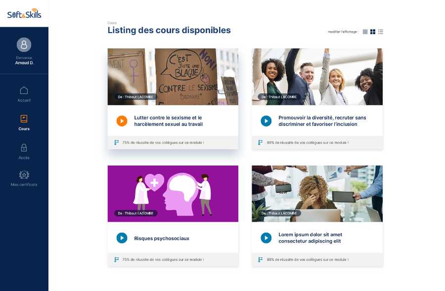 Soft & Skills est une société qui propose des formations professionnelles pour les employés d’entreprises afin de sensibiliser aux diverses interractions humaines dans le milieu professionnel (Ex. : harcèlement au travail, etc.). Ils ont fait appel à nos services afin de créer une plateforme e-learning sur-mesure convenant à leurs besoins spécifiques.